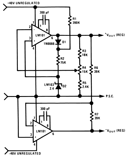 Power supply operation may be understood by considering first the positive regulator. The positive regulator compares the voltage at the wiper of R4 to the voltage reference, D2. The difference between these two voltages is the input voltage for the amplifier and since R3, R4, and R5 form a negative feedback loop, the amplifier output voltage changes in such a way as to minimize this difference. The voltage reference current is supplied from the amplifier output to increase power supply line regulation. This allows the regulator to operate from supplies with large ripple voltages. Regulating the reference current in this way requires a separate source of current for supply start-up. Resistor R1 and diode D1 provide this start-up current. D1 decouples the reference string from the amplifier output during start-up and R1 supplies the start-up current from the unregulated positive supply. After start-up, the low amplifier output impedance reduces reference current variations due to the current through R1.